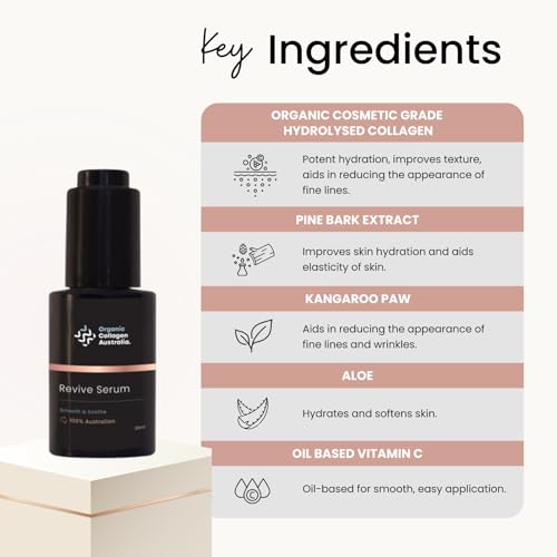 Organic Collagen Australia Revive Serum ? Hydrating Face Serum with Hydrolyzed Collagen, Aloe Vera, Pine Bark Extract & Vitamin C ? Smooths Fine Lines, Nourishes, & Softens Skin (1 oz)
