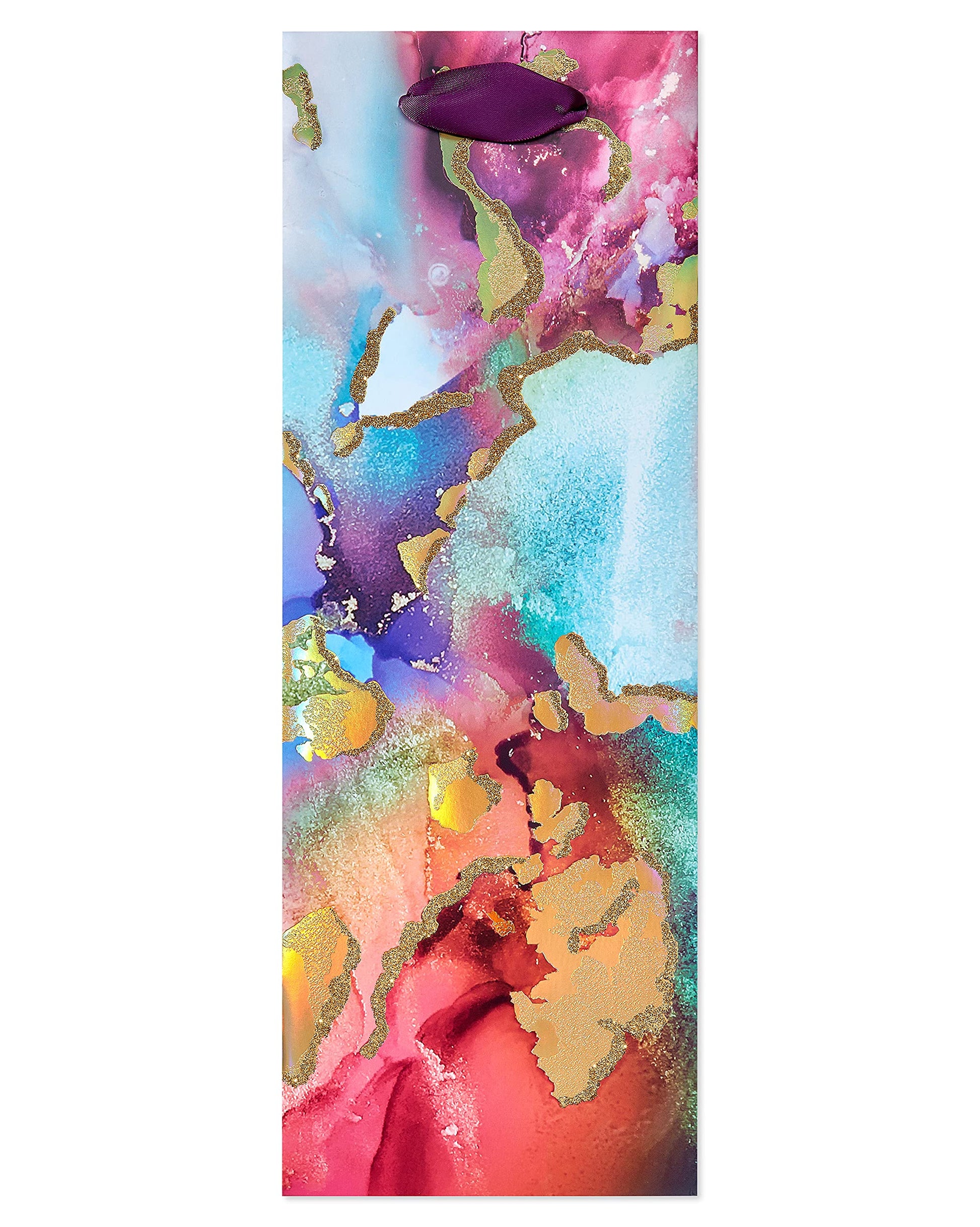 Details: Take the party out of this world with this bold galaxy beverage gift bag from Papyrus. This wine bag features a multi-colored, marbled design and is topped with gold foil and a purple satin ribbon handle. For further flare, add Papyrus tissue paper (sold separately) for a gift almost too beautiful to open. Crafted with the finest materials, Papyrus beverage bags make any giving occasion more festive! Bags can hold a wine or liquor bottle.