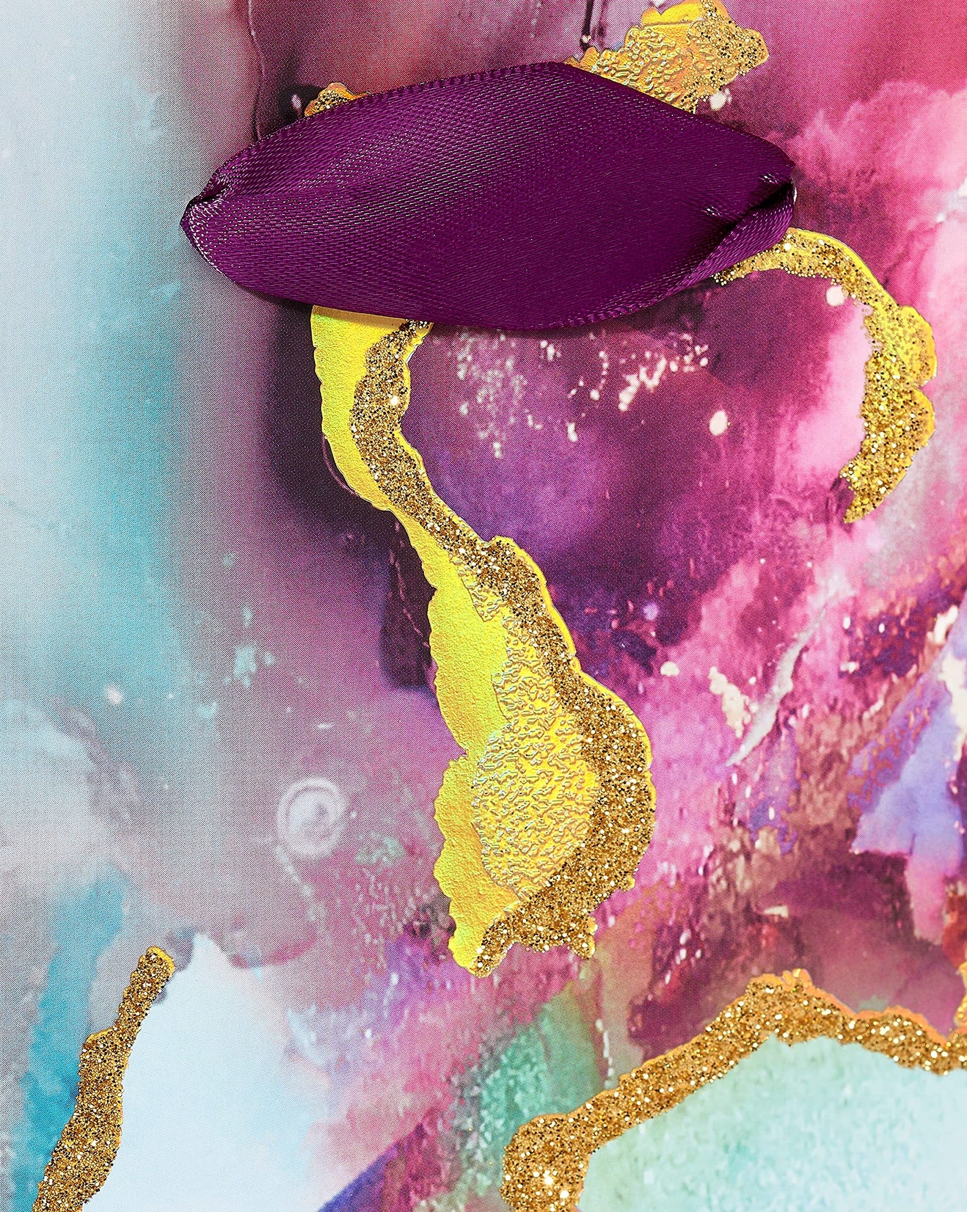 - Papyrus party bags offer solid-gold style! This wine bag features a mutli-colored marbled design topped with all gold foil and a purple satin ribbon handle