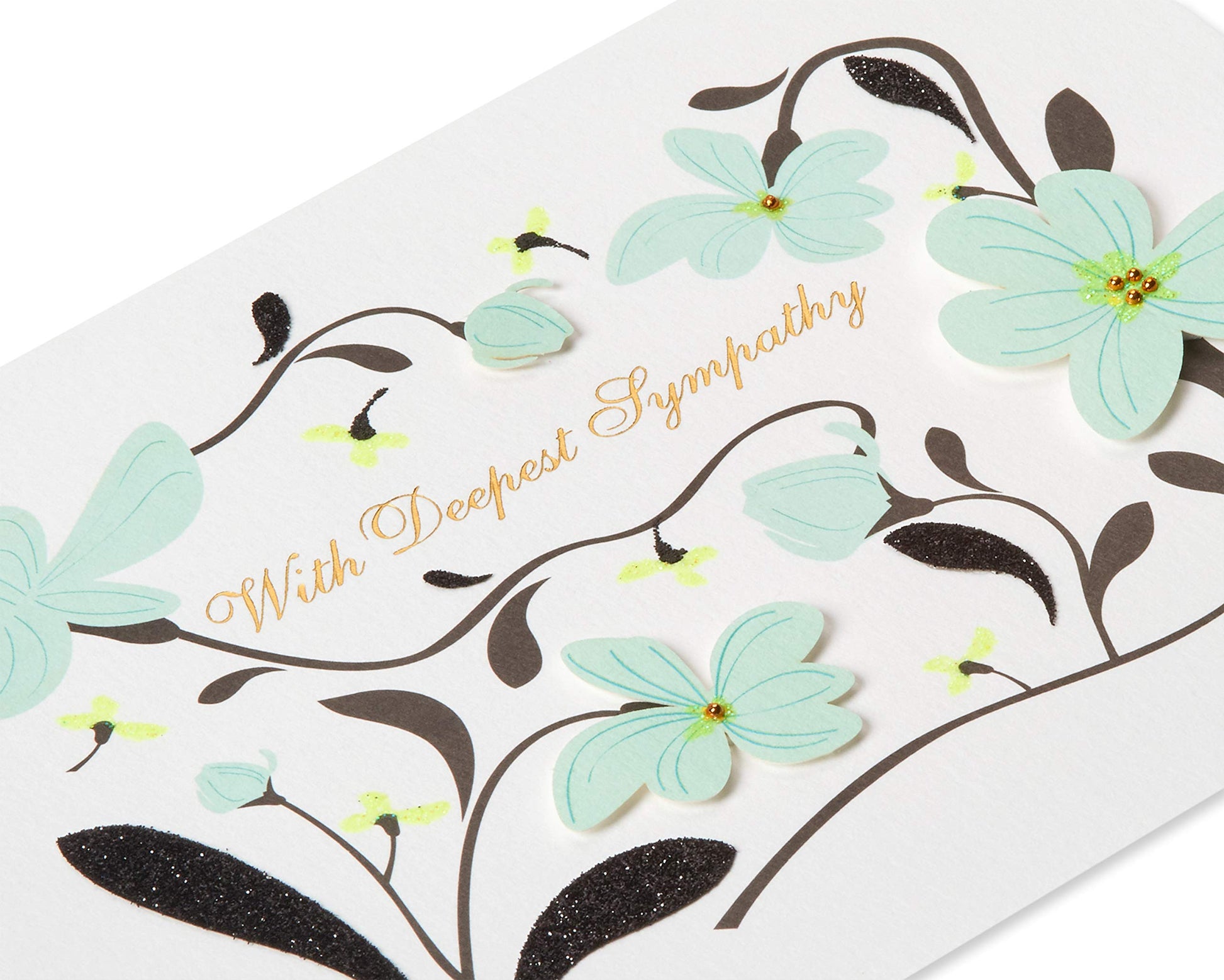 Details: Let them know you’re thinking of them with this hand-crafted sympathy card from Papyrus. Featuring a lovely floral design in light aqua and embellished with beads, foil, glitter, and paper-sculpted petals, the elegant art is complemented by a simple-but-heartfelt message in beautiful gold script. A matching aqua blue envelope and gold foil seal are included, and extra postage is required.