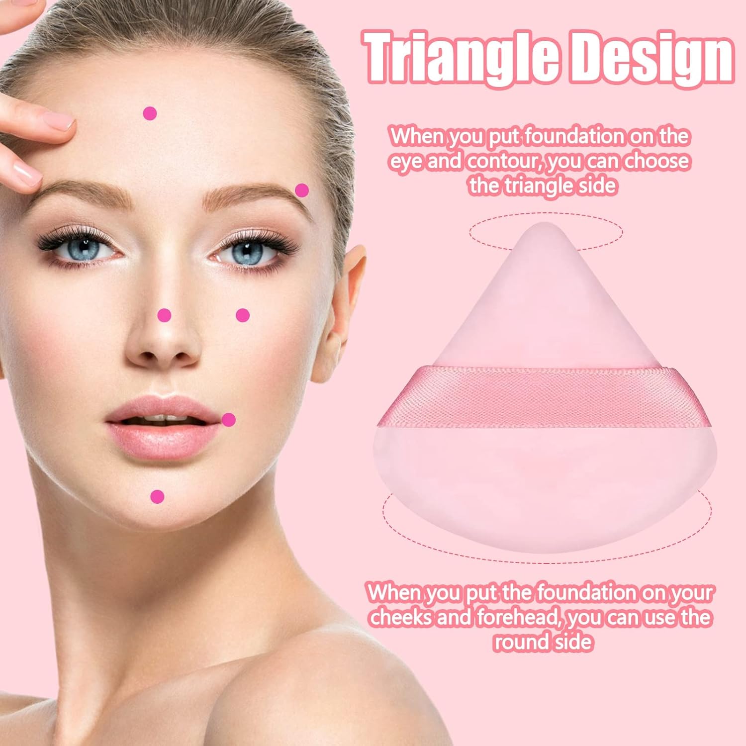 - [Triangular and Circular Design] This powder puff is designed in a triangular and circular shape. Use the round side for applying foundation to larger areas like cheeks and forehead, and the triangle side for precise application around the eyes and contours. Bid farewell to uneven makeup!