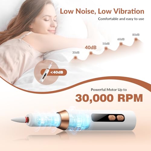 - ¡¼Powerful Motor & 30,000RPM¡½This nail grinder set with a quieter and more powerful motor, low vibration and quick heat dissipation. Up to 30,000RPM With 12pcs different nail drill bits, 36pcs sanding bands, making it easier to trim and polish thick nails, dead skin, calluses and corns on hand and feet. You don't have to worry about the electric nail drill stopping when pressure is applied during grinding.