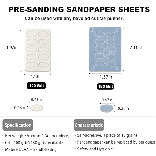 - Efficient Cuticle Care - You will get 1pc double head loop cuticle pusher/slant nail pusher and 1pc(10 grains) 100 grit rougher sandpaper, 1pc(10 grains) 180 grit fine sandpaper. It's safe and effective to clean up nail dirt, remove dead skin, file natural nails and so on, without damaging the nail surface and leaving no dead space.