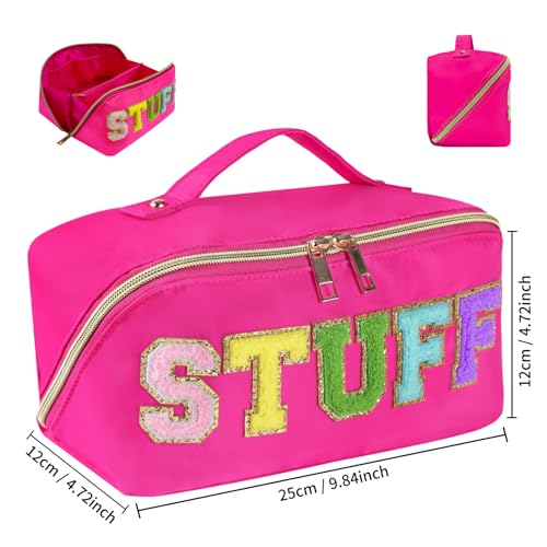 - Glitter Chenille Letter Design: Monogram stuff bag is well-made, with colorful chenille letter patches and glitter sequins that is not attached to the surface of the toiletry bag, but firmly sewn onto nylon makeup bag, so you don't worry about them falling off. The combination of fluffy chenille letter and sparkling sequin is simply a highlight of personlized makeup bag, the latest fashion trend in 2024, and stuff bag is like a beautiful scenery line that can earn you super high attention