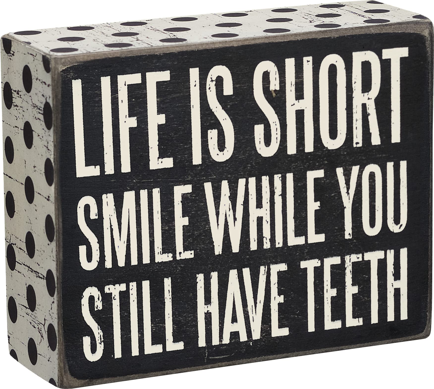 Details: Primitives by Kathy's Life is Short box sign is made of wood and can sit or hang. It reads "Life is Short smile while you still have teeth". Primitives by Kathy is a leading producer of high quality decorative box signs and home decor.