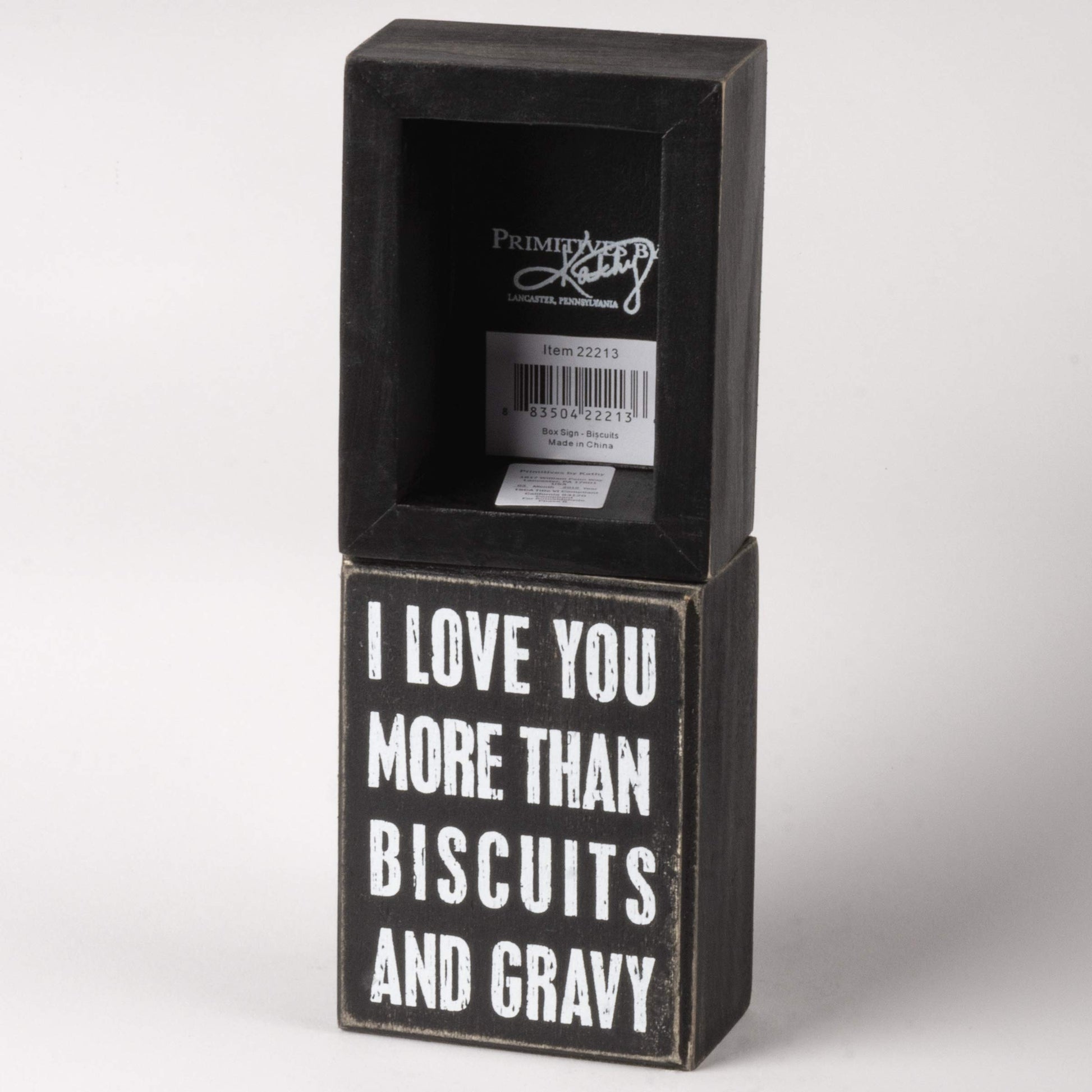 Details: Primitives by Kathy's Biscuits box sign is made of wood and can sit or hang. It reads "I love you more than Biscuits and Gravy". Primitives by Kathy is a leading producer of high quality decorative box signs and home decor.