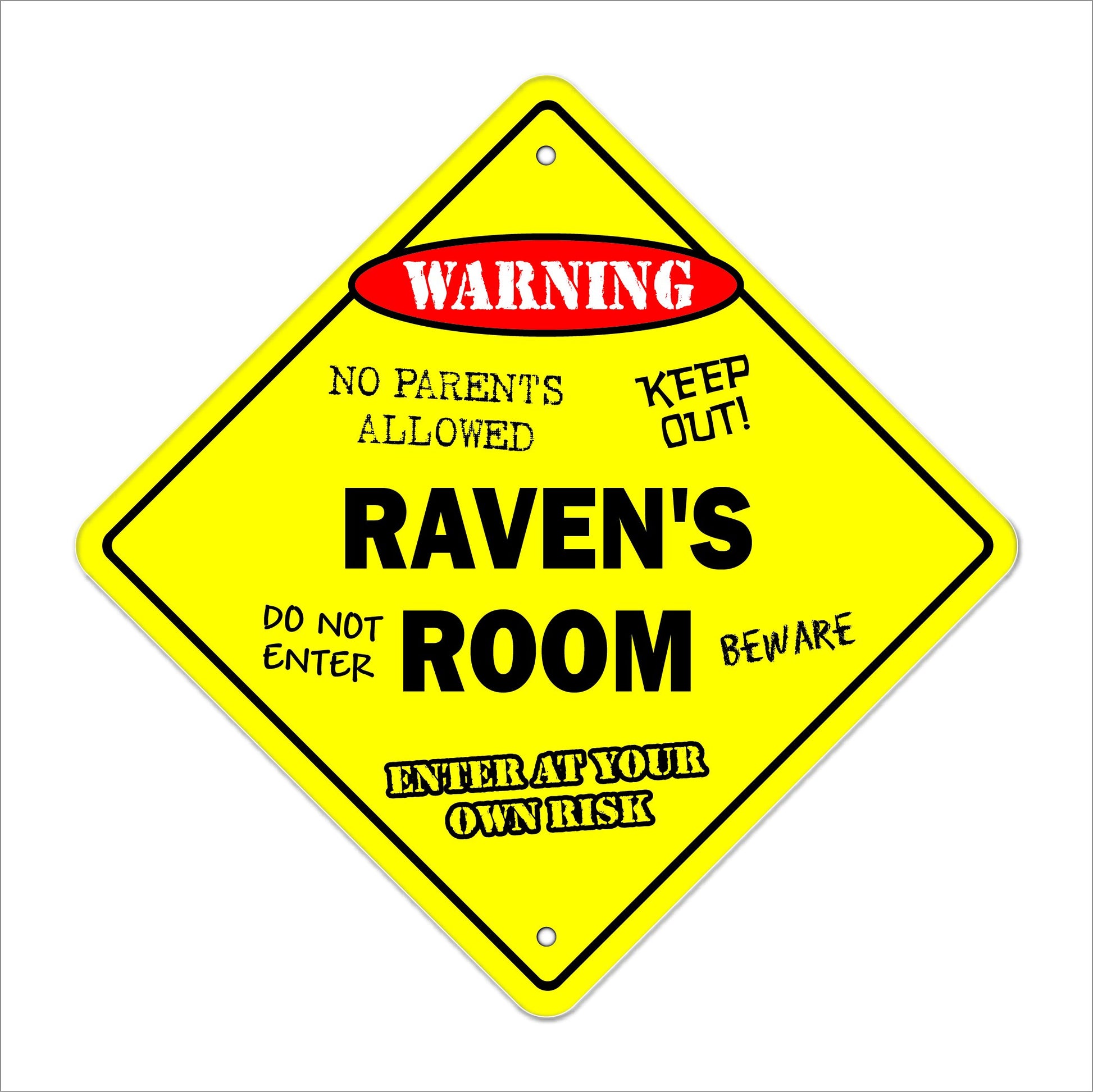 Details: Everybody loves personalized gifts and this is perfect for those kids in your life Made in the USA these signs are sturdy weatherproof plastic 12 tall and 12 wide diamond shaped with rounded corners and 2 cut mounting holes. Made Tolast Made from a special plastic designed to hold up to a beating, This sign can bend with out breaking and will never chip or crack, the colorful lettering will last a lifetime indoors and up to 4 years in the sun for outdoor use. Safe for A Childs Room Our signs have rounded edges and our made of a very strong but lightweight plastic so you can hang it in your child's room without the worry of it falling and hurting your child or cutting them with sharp edges. Product Details: Raven's Room Sign Pre-Cut Mounting Holes Indoor and Outdoor Use Rust and Fade Resistant One-Sided Scratch Resistant treated Ink Dimension: 12 Tall x 12 Wide Made in the USA Outdoor Durable Plastic Click Add to Cart to get your Raven's Room sign today and enjoy a good laugh each time you pass by!