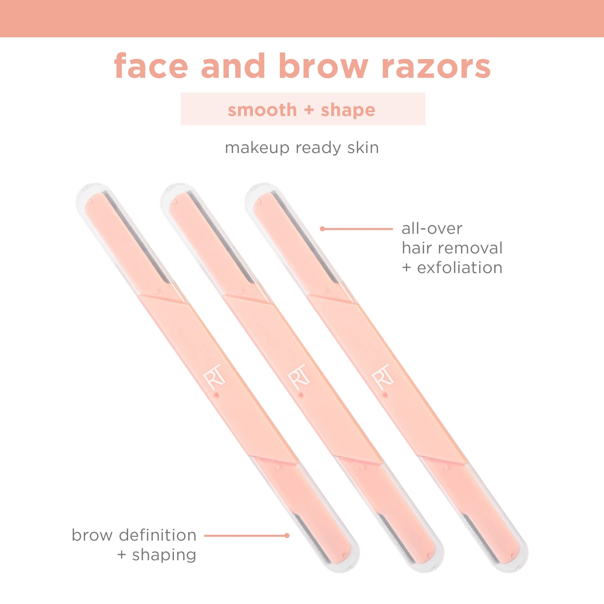 Details: Easily remove dead skin cells and unwanted facial hair for a smooth, makeup ready complexion with the Real Techniques Face and Brow Razors. An important step to having smooth, even makeup is taking care of your skin underneath. Let your fresh, natural skin shine through! Ideal for any skin type. These razors are dual ended – the larger blade is meant for all-over facial use and the smaller blade is meant for brow detailing. For all-over facial hair removal and exfoliation, run the larger blade in small, downward motions across the face. For brow definition and shaping, run the smaller blade in small, downward motions near the eyebrow while being cautious of the eye. For best results use on a clean, dry face at night every 2-4 weeks. Apply skincare products as normal afterwards. Pro Tip - perfect time to give your skin some extra love with a hydrating skincare routine! These razors come in a pack of three each with their own protective caps for safe and clean storage. We are Real Techniques, the brand of choice for all makeup users, no matter your level of expertise. Created in collaboration with leading makeup artists, we aspire to take the mystery out of choosing beauty tools so you can focus more time on putting your best face forward one blend at a time. From full makeup looks, to quick beauty hacks, RT brushes + sponges are exceptionally high quality for professional looking results every time. BUT… don’t be fooled by our affordable prices, RT tools are award-winning + purposefully designed because that’s what you deserve. Quality without compromise.