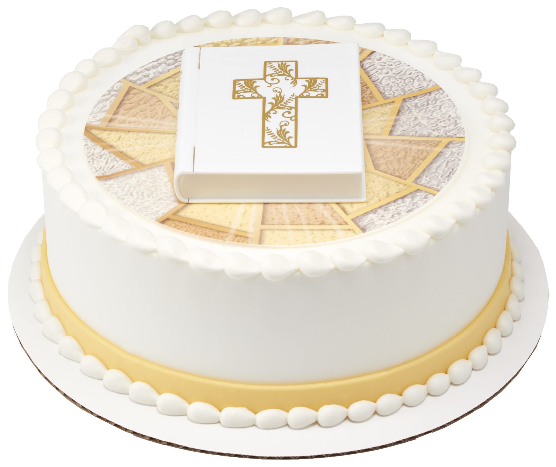 - Religious DecoSet Cake Topper - Celebrate your religious event with this Religious DecoSet Bible and Gold Cross Cake topper that features a keepsake Bible box and Cross bookmark.