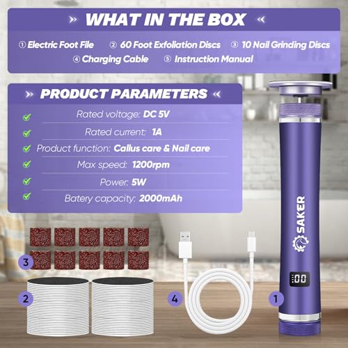 - ¡¼REPLACEABLE SANDPAPER DISCS FOR VERSATILITY¡½Saker foot file electric includes 60pcs foot exfoliation discs and 10pcs nail grinding discs. The high-quality, self-adhesive sandpaper is durable and easy to replace, ensuring that each person has their own hygienic disc. This versatility allows you to maintain both your feet and nails with a single tool, making it an all-in-one solution for at-home grooming.