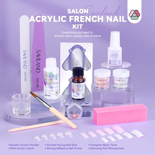 SAVILAND Acrylic Nail Kit: Keratin Acrylic Powder with Castor Oil Vitamin E Nail Primer Nail Glue French Tips Pink Rhinestones Complete Tools Everything for Beginners DIY Home Salon Christmas Gift