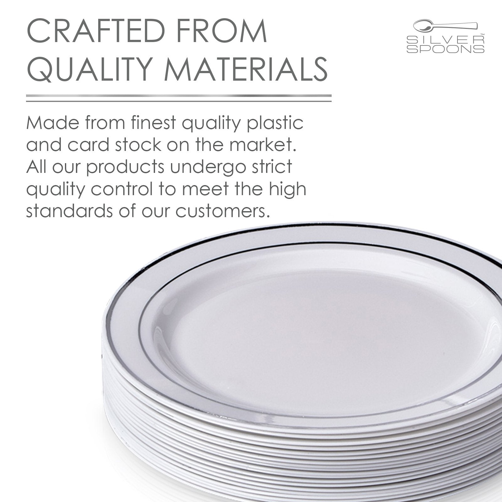 7.5” White with Silver Border Side Plates 100% nature-friendly and non-toxic. Made from high-grade heavyweight plastic and paper material. Sturdy plastic plates won’t easily snap, sag, or break Designed with wide rims to avoid spills. Durable to use and handle. Leak free, soak-proof, cut resistant and unbreakable. Resists any sharp object. Crafted to carry heavy food items and to handle hot and cold dishes. High-end look at an affordable price