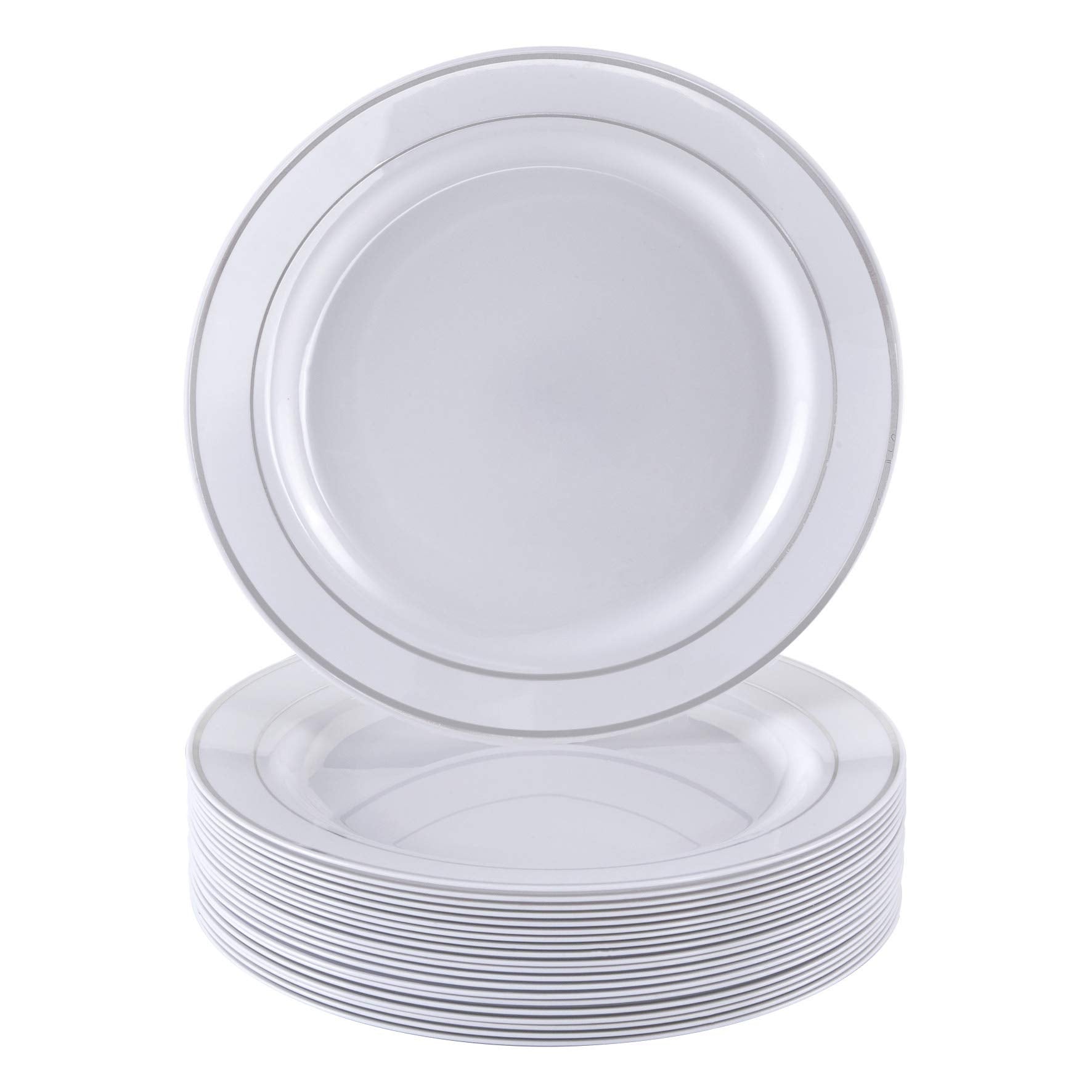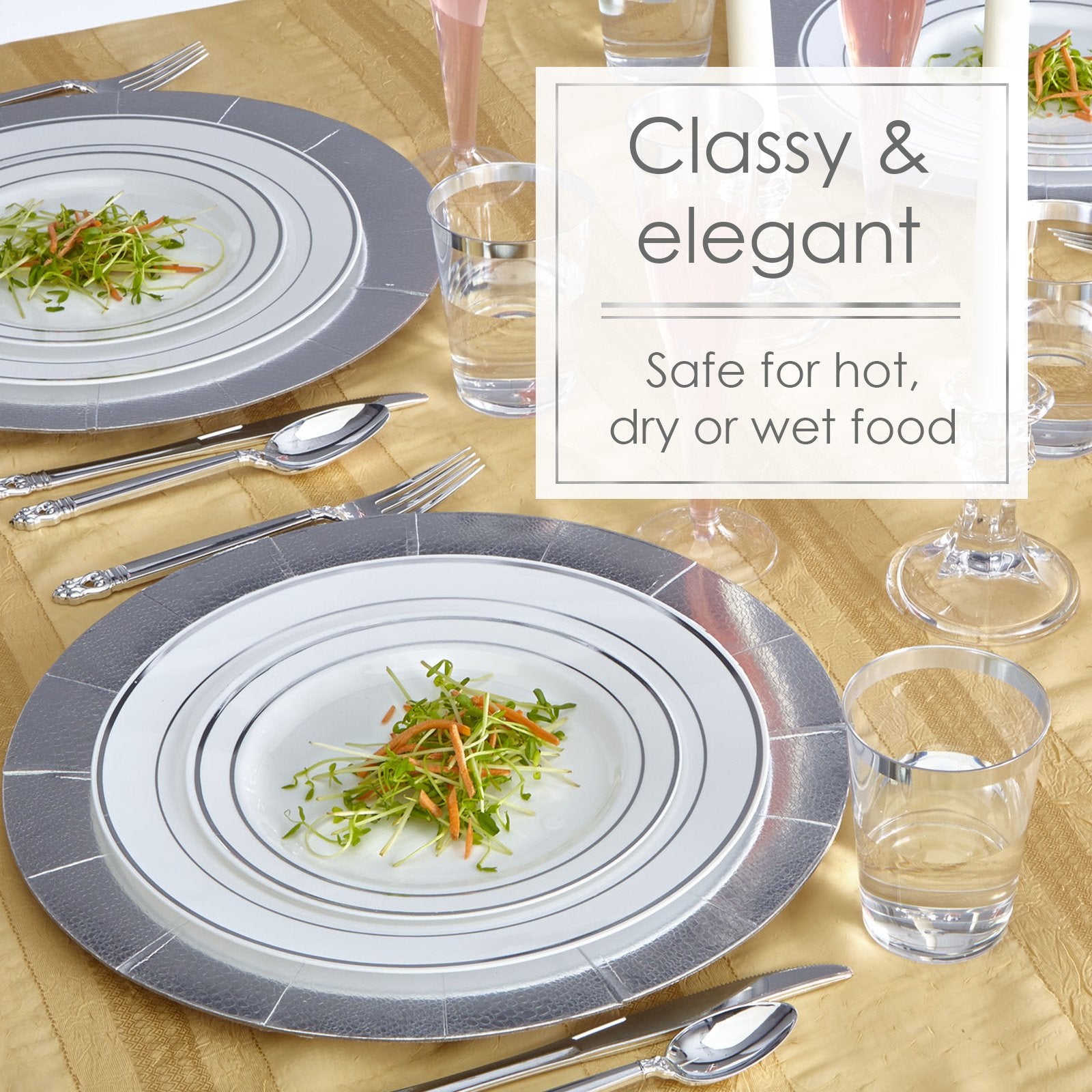 Details: Family get-togethers have never been easier with Silver Spoons Golden Glare Collection Classic dinnerware set. From backyard barbecues to Thanksgiving dinner, these white with silver border round plates serve all your tableware needs. Your guests won't believe these plates are made of plastic.