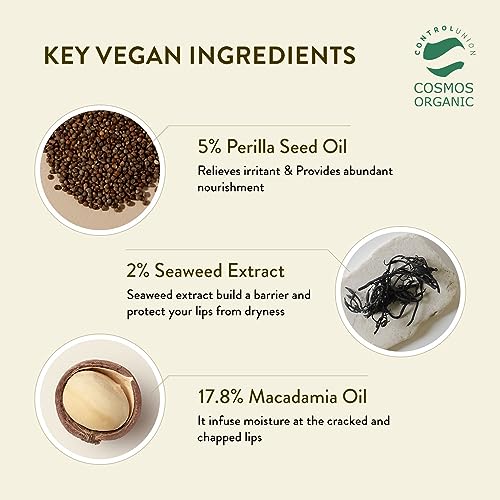 - Formulated with 93.4% organic ingredients, including cold-pressed perilla seed oil, coconut oil, olive oil and shea butter, lip balm comes in a rich yet quick-absorbent texture that melts instantly onto skin