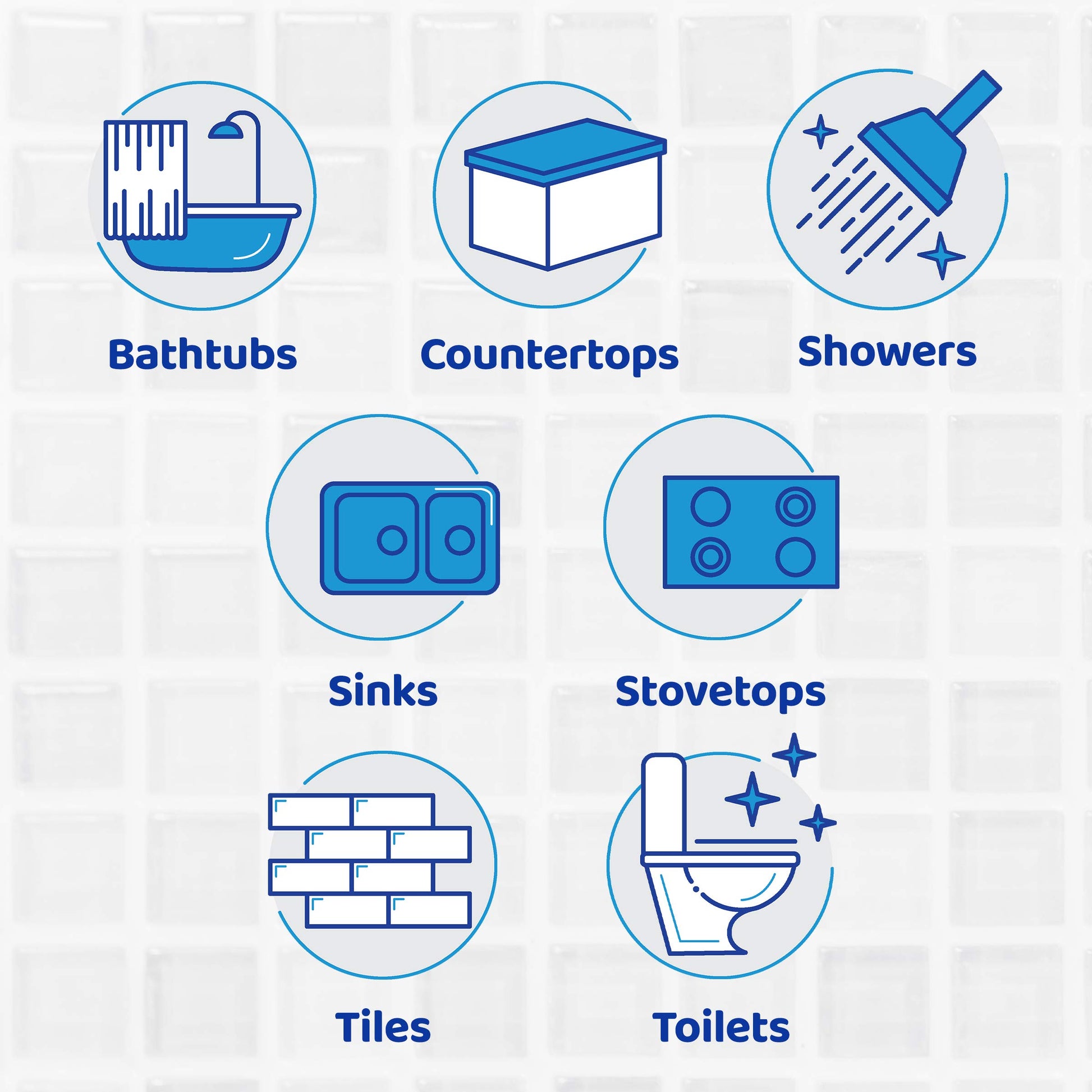 - Use on bathtubs, countertops, showers, sinks, stovetops, tiles, and toilets.