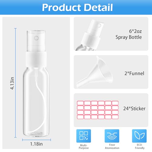 Spray Bottles, 2oz/50ml Clear Empty Fine Mist Plastic Mini Travel Bottle Set, Small Refillable Liquid Containers with 2pcs Funnels and 24pcs Labels (6 Pack)