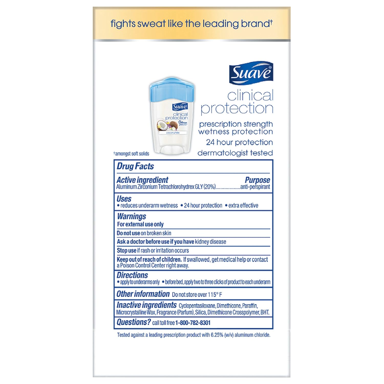 - Suave Clinical Protection Coconut Kiss Antiperspirant Deodorant stays on skin, not on clothes, so you get effective underarm protection with no messy residue.Proven to work as well as specialty brands, Suave Clinical Deodorant for women is a great value