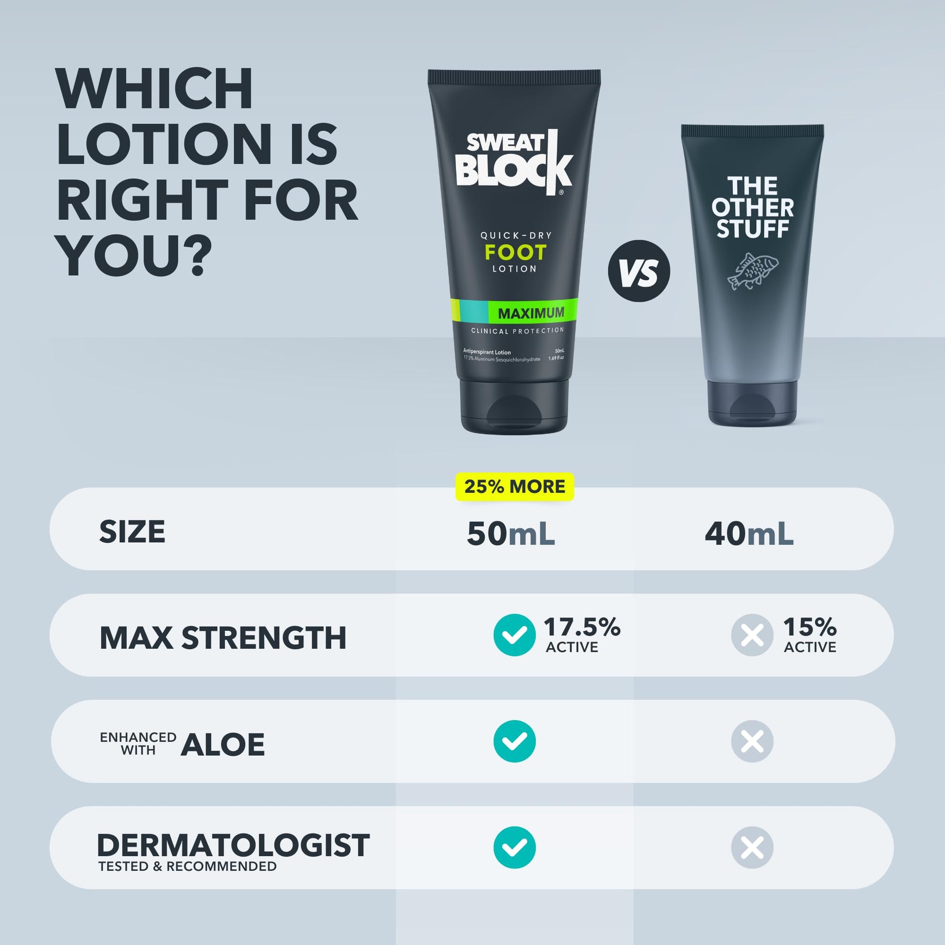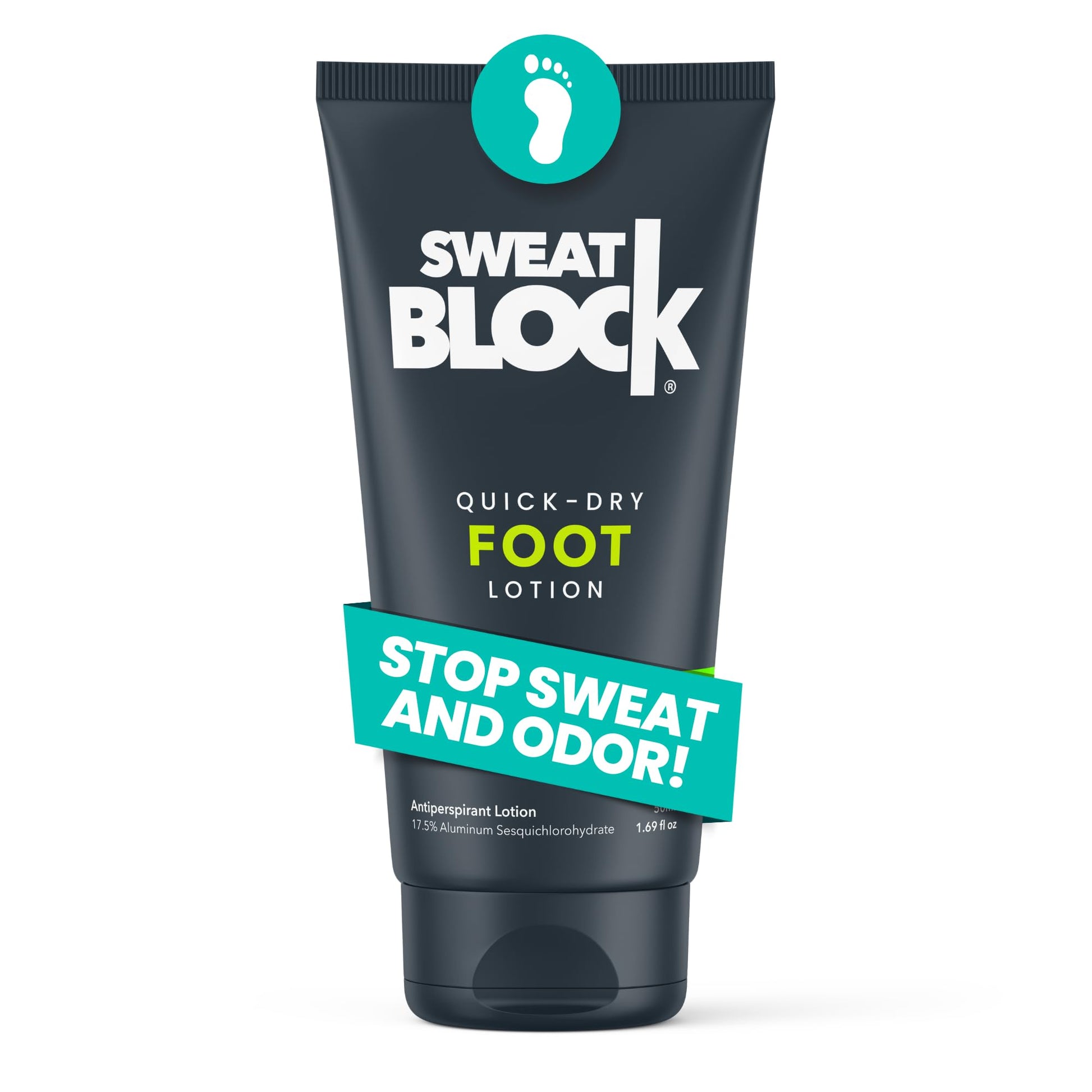 - STOP FOOT SWEAT & ODOR: SweatBlock Antiperspirant Lotion for feet is specially formulated to treat plantar hyperhidrosis and reduce excessive foot sweating. This dermatologist-tested lotion delivers clinical strength protection while also acting as an effective foot deodorant to block odor at the source. Whether you're in boots, sneakers, or going barefoot, this lotion helps prevent sweat and odor so you stay dry, clean, and confident all day.