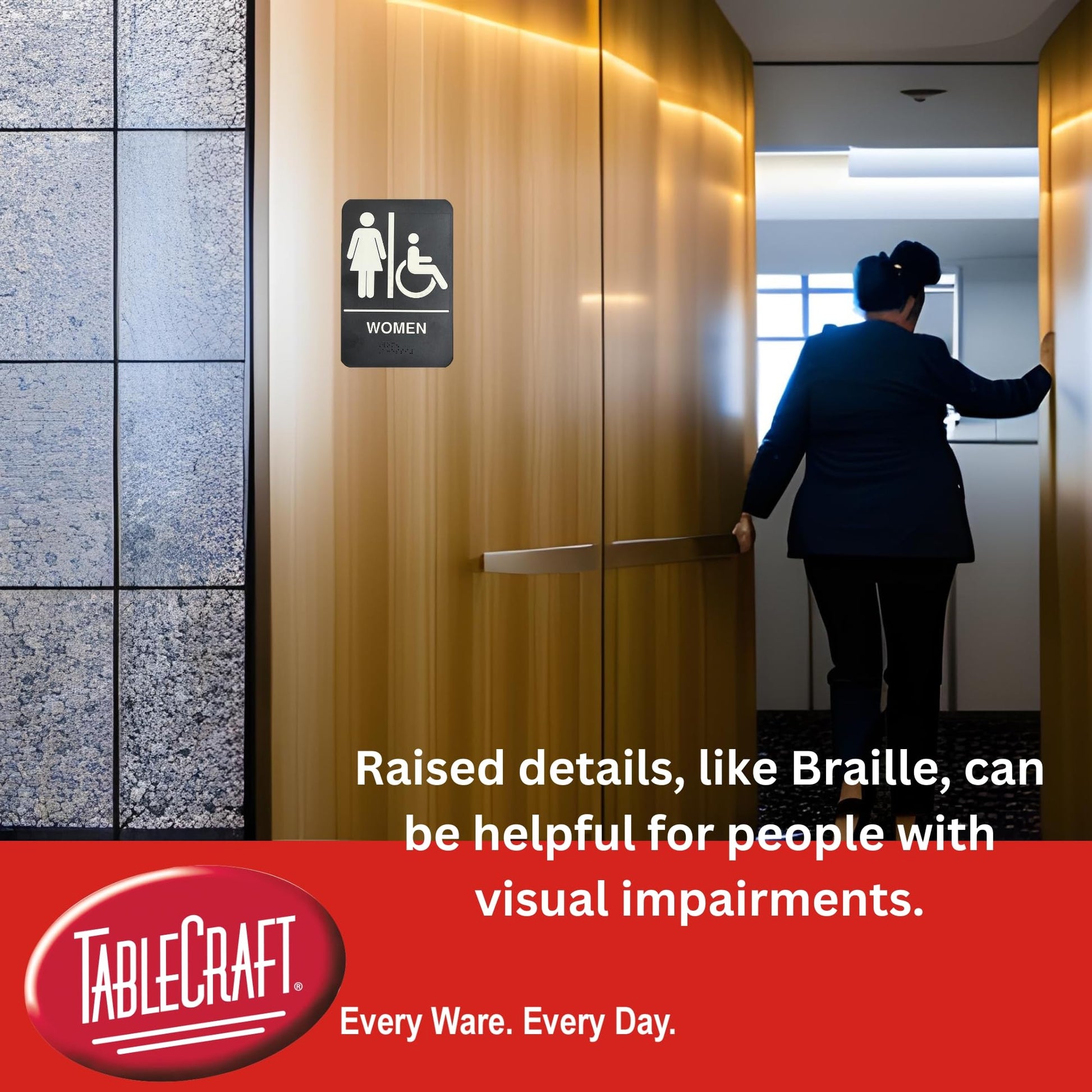Details: Elevate your facility’s accessibility and professionalism with thIS TableCraft 695630 Women Handicap Accessible Bathroom Sign. This ADA bathroom sign features bold raised text, clear braille, and easy-to-understand handicap symbols, ensuring everyone can confidently navigate to the appropriate restroom. Designed to meet ADA restroom sign requirements, this durable and practical signage is perfect for restaurants, offices, retail spaces, and any location that needs compliant restroom signage ADA-approved.