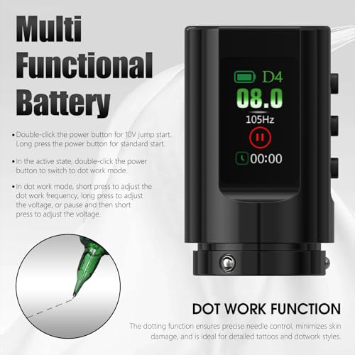 - ¡¼Long-Lasting Wireless Tattoo Gun¡½This wireless tattoo gun kit is powered by a 1600mAh battery, delivering 4-6 hours of continuous use at 8V. The Type-C fast charging fully recharges in 2.5 hours, minimizing downtime?ideal for freelance artists and mobile tattooing