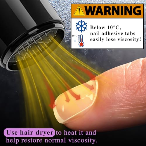- Tips for Long Lasting Especially in Cold Weather: Nail Adhesive Tabs also call jelly glue, stickiness is very affected by the weather. For better stickiness, you can use sponge file to file nail surface to make it rough; stick it on nail, use hair dryer to heat it for 15s; use wooden stick push flat to full cover your nail surface; remove thin film then use hair dryer to heat it 15s again; stick false nails and press 30s. Make sure long-lasting, please wash your hands after 1-2 hours later