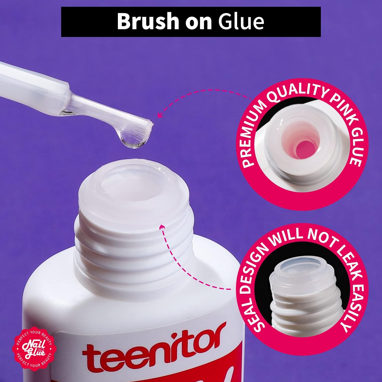 - Super Strong & Dry Quickly: Our Teenitor 7g strong nail glue for press on nails is made of premium quality pink glue which is different from others, strong adhesive allow long lasting to 14-21 days-Easy to Use, Long Lasting , Fast Drying, Water Resistant and No Curing Lamp Need; seal design of bottle will not leak easily and better keep the glue
