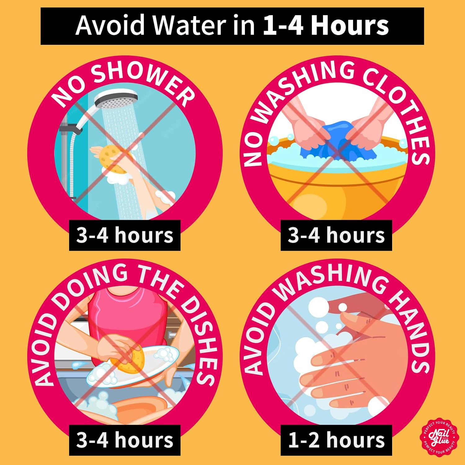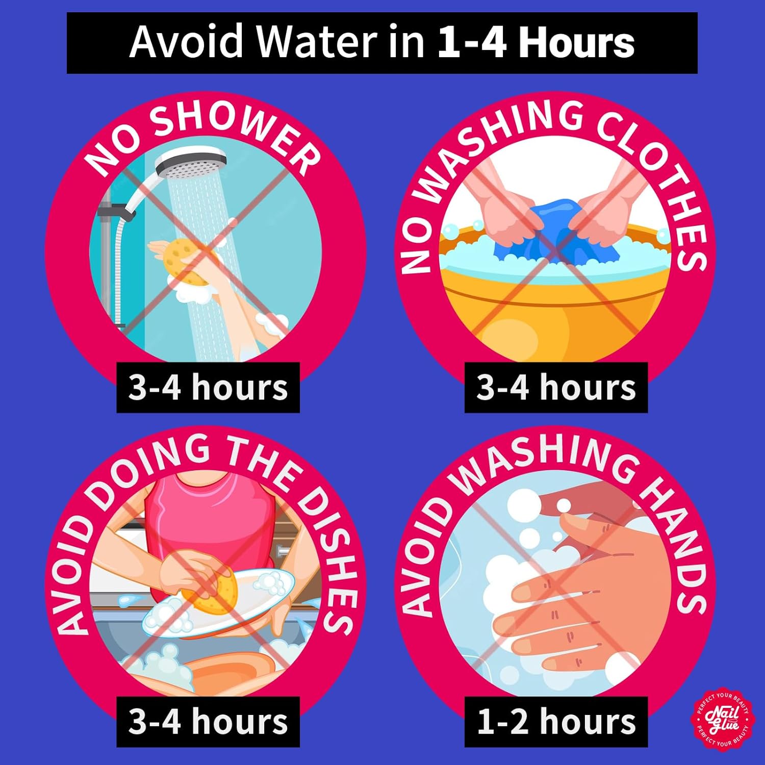 - Tips for Better Stickiness & Longer Lasting: Please avoid touching water in 1-4 hours, especially take a shower, wash clothes or do the dishes, avoid washing your hands in 3 hours after applying nail glue; you can use nail file to file your nail bed to make it rough then apply nail glue will get better stickiness