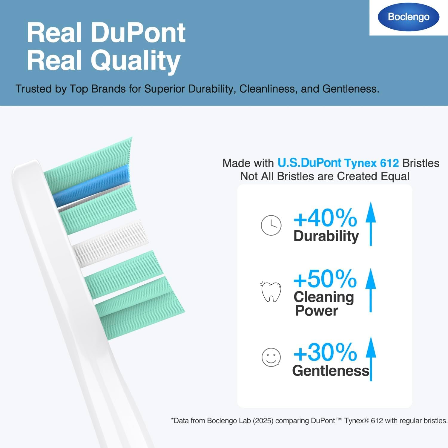 - CARE FOR TEETH & GUM HEALTH - More gentle touch and comfortable brushing! Feel the difference between U.S. genuine premium DuPont bristles (the bristles are the same as the name brand). Boclengo toothbrush heads for Phillips Sonic Care feature the Higher Ratio DuPont End-Rounded bristles which achieves an optimal balance of cleaning and gentleness, preventing irritation and protecting teeth and enamel.