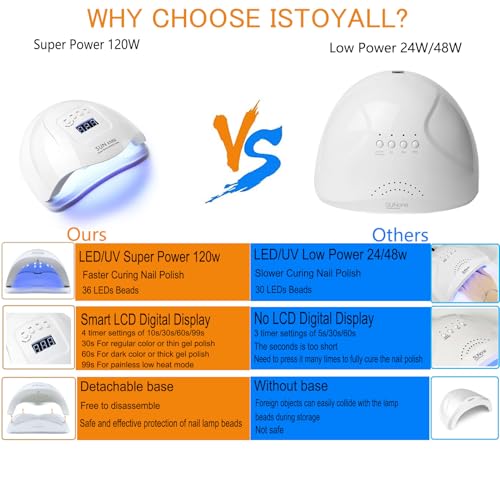 - ¡¼UV LED Nail Lamp¡½Powerfully and Efficiently, 72W High Power LED nail lamp has 36 quality LEDS that can maximally save your 70% curing time. 4 Timer Settings-10S/30S/60S/99S durable and easy to use.Innovative painless low heat, makes you feel comfortable during curing nails. It can perfectly cure all kinds of UV/LED based gel products, no worry for curing hard gel/builder. With smart auto sensor and screen also allows you to see the timer clearly.