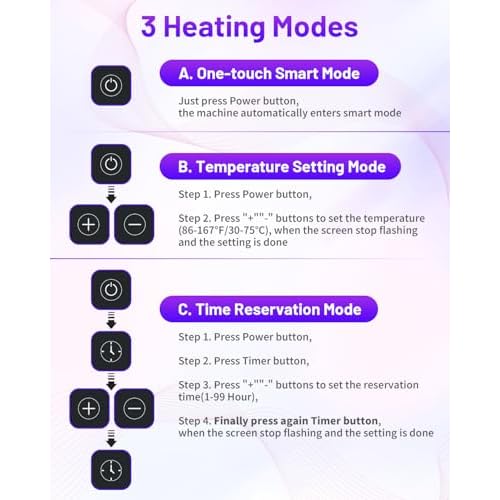 - 3 Heating Modes Available: One-touch smart mode, temperature setting mode and timer reservation mode for your different needs