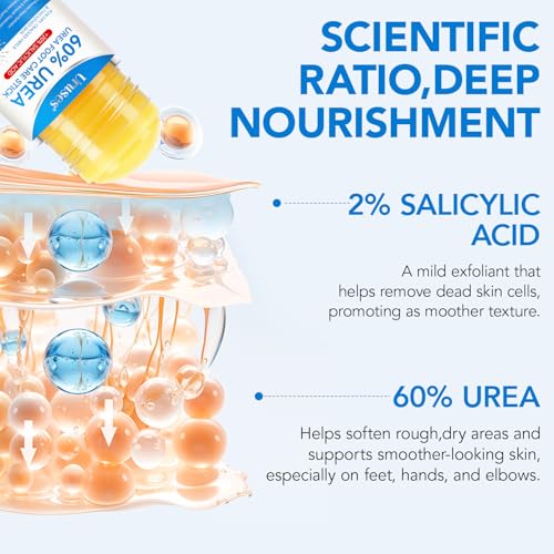 - Foot Cream: This foot cream combines 60% urea and 2% salicylic acid to exfoliate dead skin while intensely moisturizing. Perfect for cracked heels, rough patches, and calluses skin.