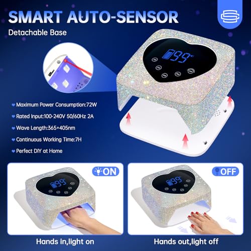 - ¡¼5-Timer Settings & Intelligent Sensor¡½Our nail UV light features a heart-shaped full-touch LCD display with 5 timer settings: 10s, 30s, 60s, 90s, and 99 seconds. On top of that, the infrared sensor lights automatically activate when you place your hand under the light, and they turn off when you remove it. This smart feature ensures the curing process is both convenient and time-saving