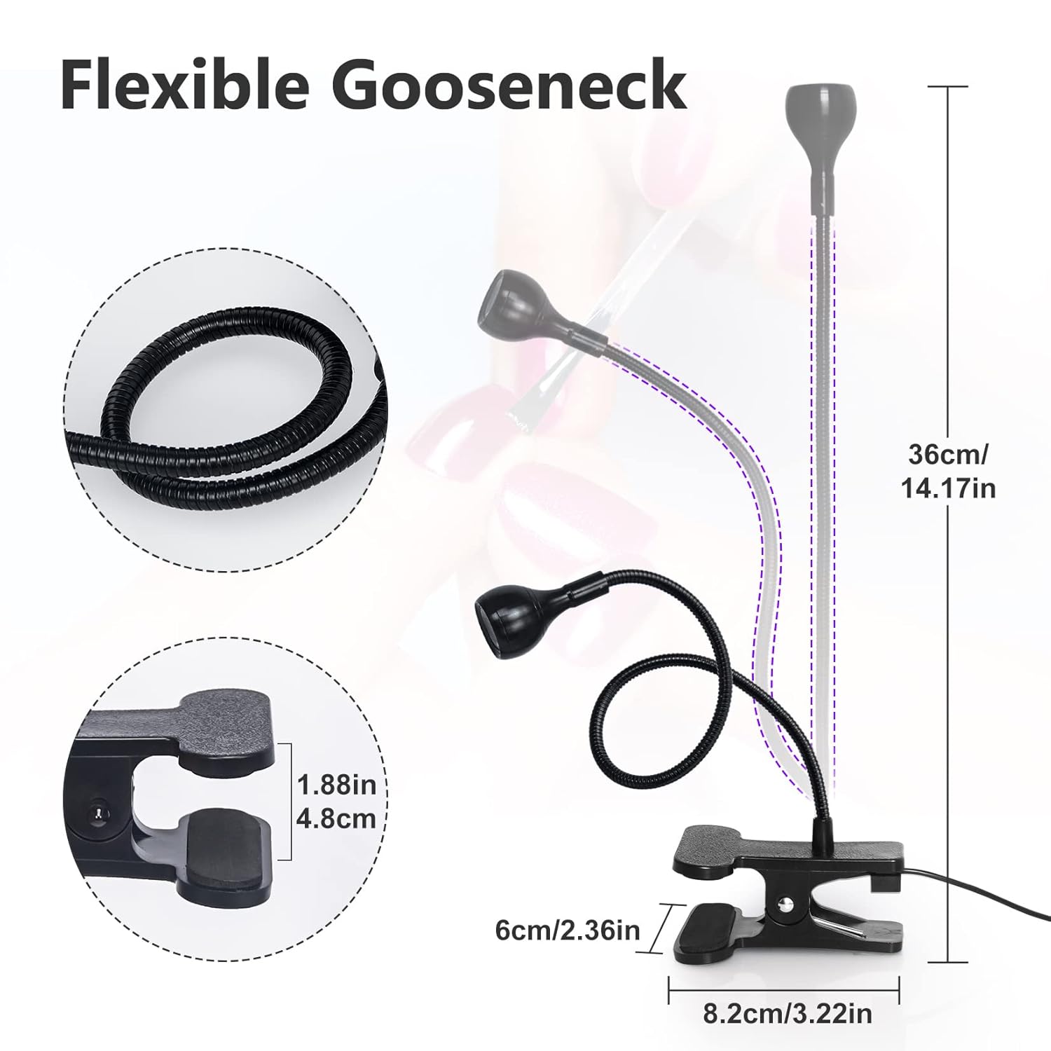 UV Nail Lamp - UV Light for Gel Nails, LED Gooseneck Flash Cure Lamp for Nails, Manicure Dryer Black Light with Clamp, 365+395nm Wavelength 5V 3W 4 Levels Dimming