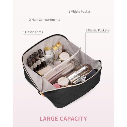 - ¡¼Large Capacity¡½ Measuring 9.84 x 5.12 x 5.12 inch. The large coquette makeup bag offers roomy space for all daily-used cosmetics and toiletries. Features 2 main compartments, 2 elastic pockets,4 elastic cords and 1 clear pocket for organized storage