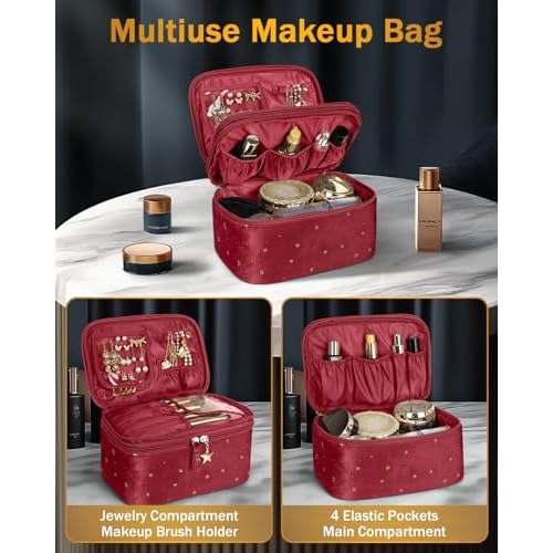 - Multiuse Bag: Wedama makeup bag is double-layer design, which makes the bag multifunctional. The first layer is separate jewelry storage and brush holders. The second layer is included 4 * elastic pockets for foundation and lipsticks and large capacity main compartment for other makeup or toiletry essentials. Perfect travel makeup bags for women.