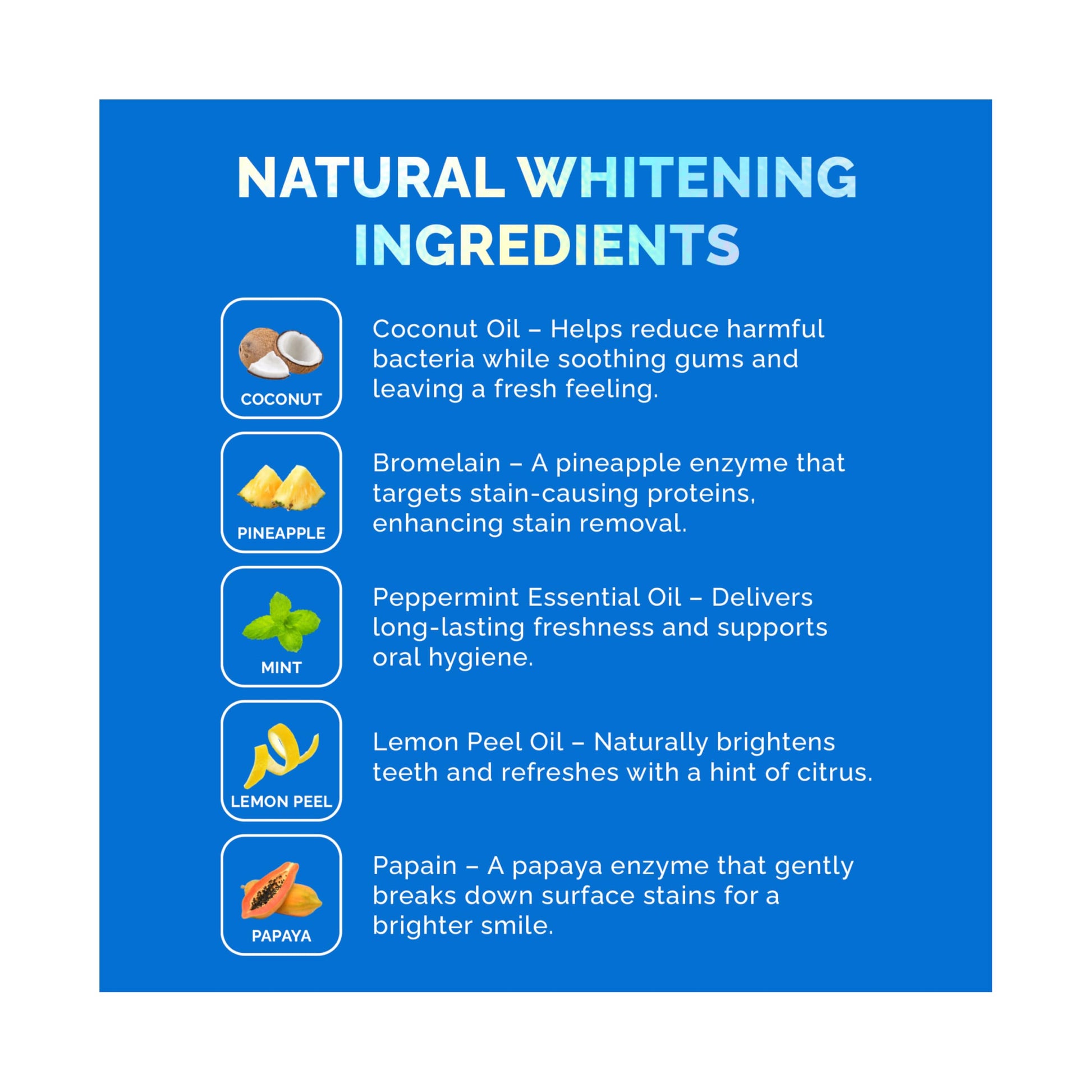 - šæ MINT+COCONUT-INFUSED NATURAL FORMULA ā Infused with mint plus coconut extract and plant-based ingredients, these natural whitening strips are a fresh, natural alternative to harsh peroxide treatments.