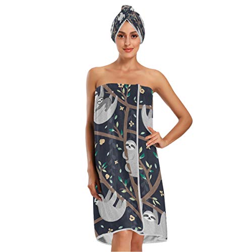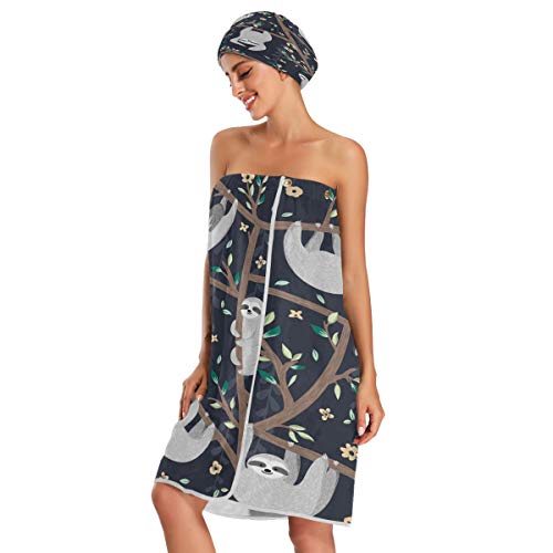 Women's Spa Towel Wrap Set of 3, Cute Sloths Bathrobe Shower Bath Body Wrap with Adjustable Closure