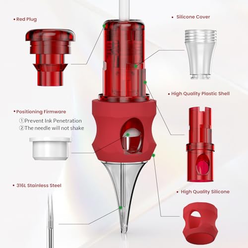 - HIGH QUALITY: The cartridge needles are made of high material PVC and stainless steel, which are healthy and durable to work; With a high elasticity rubber plug connection, preventing tattoo ink flow back; The tattoo needle edges are specially designed to catch more ink and make the tattoo ink flow well, prevent ink leakage or pigment leakage, and protect the tube and tattoo machine;