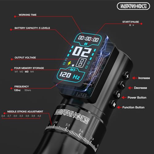 - Compact and ergonomic, this high-performance wireless rotary tattoo pen offers quiet operation and intuitive control via a digital display with adjustable speed settings. Featuring Memory Function and Dot Work Mode, it delivers versatile performance in a sleek black design?ideal for both professionals and beginners seeking reliable, user-friendly tattoo equipment