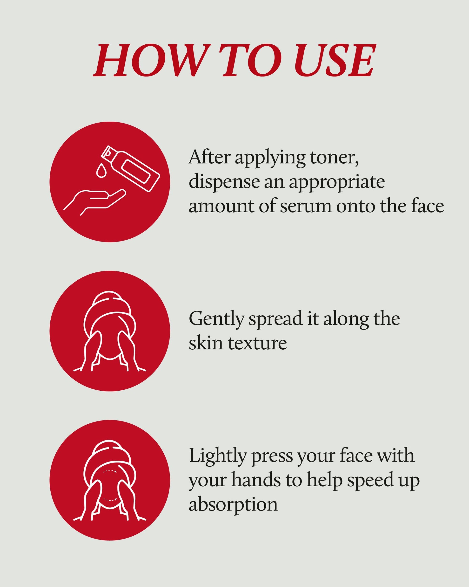 - How to Use: After cleansing and toning, apply a few drops of the serum to your face, gently spread it, and press lightly for full absorption, morning and night.