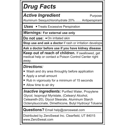 - HIGHEST STRENGTH ANTIPERSPIRANT | ZeroSweat provides the highest strength antiperspirant without a perscription. Specifically designed to stop excessive sweating for over a week with one application. Confidence booster to give you your life back.