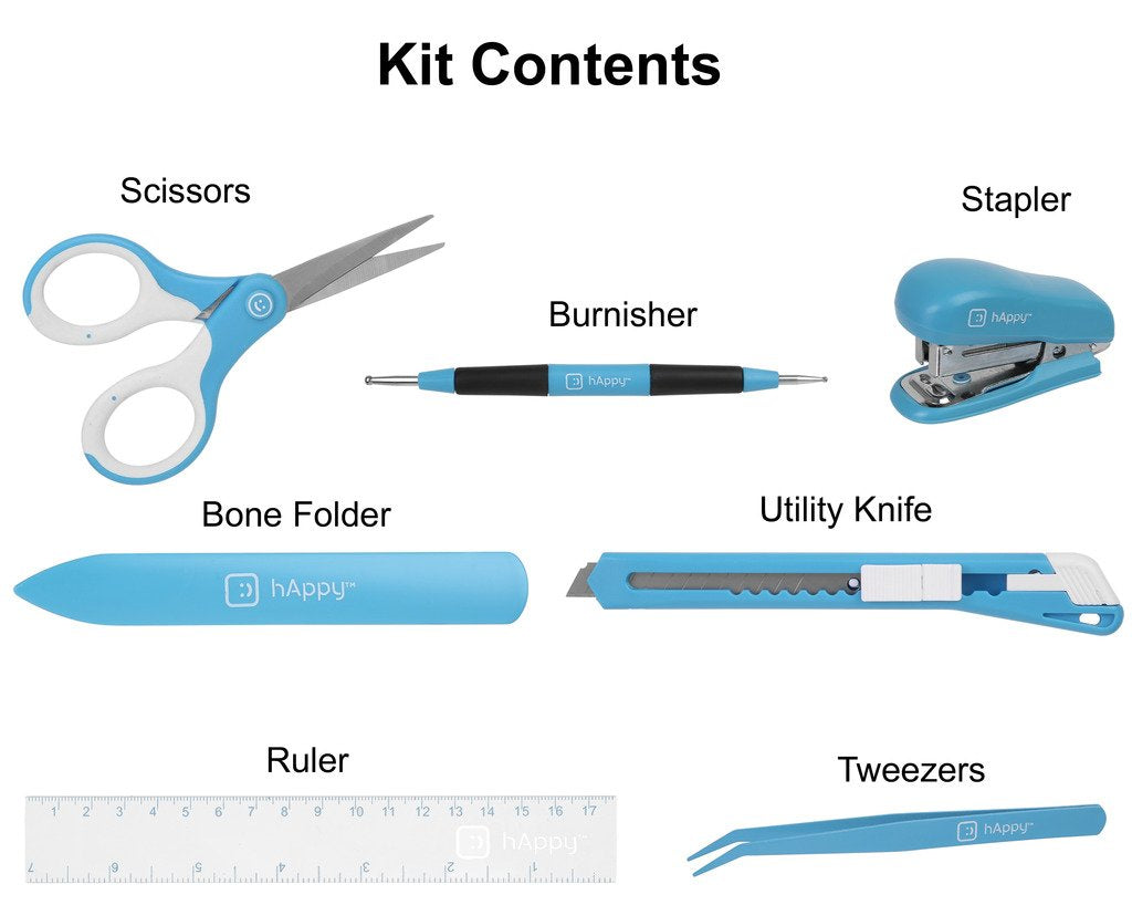 - Includes Scissors, Utility Knife, Ruler, Burnisher, Bone Folder, Tweezers & Stapler
