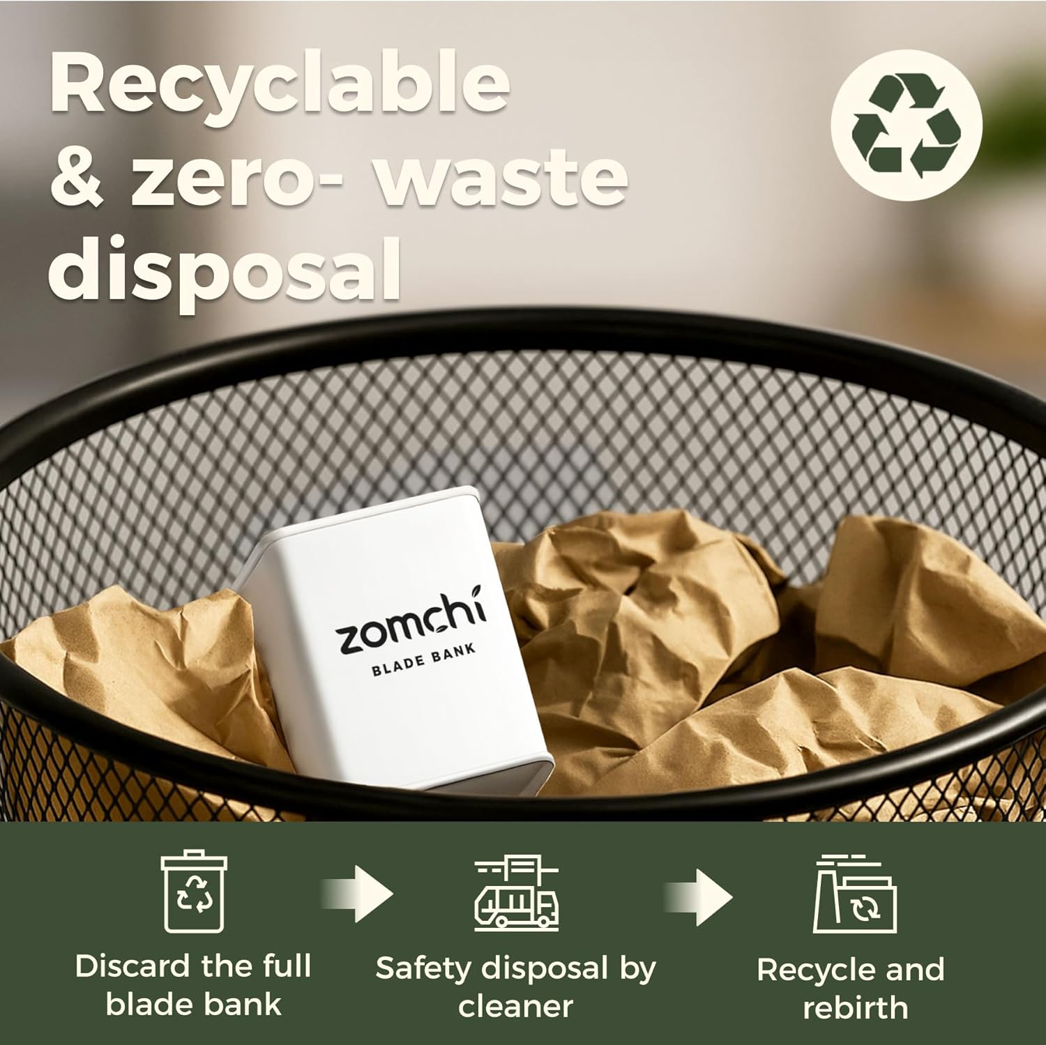- PROBLEM SOLVED: This blades disposal case comes out, perfectly resolve their puzzlements of abandon the used blades. Find your double edge blades a safety home rather than let them disposed of soil, water, any place that they will hurt creatures alive. Let them go into the new home — the Zomchi blade bank. After scientific recycled, they will refresh a new life like a Phoenix from the Ashes.